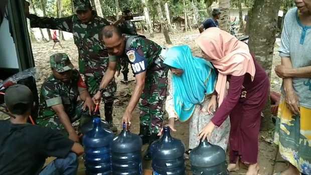 Lebak – Para warga yang terdampak banjir di Desa Bayah Barat, Kecamatan Bayah, Kabupaten Lebak berbondong-bondong membawa wadah galon dan ember untuk menampung air bersih yang disediakan oleh Anggota TNI Kodim 0603 Lebak.